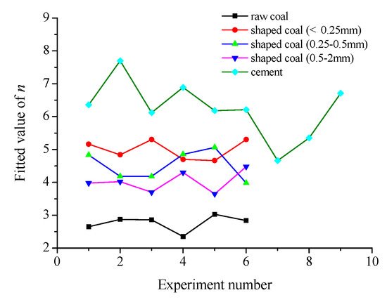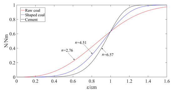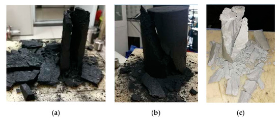 Shaped coal specimens were taken from the 24080 working face in 10th coal mine of Pingdingshan Tian’an Coal Industry CO., LTD in China. Two standards, i.e., the preparation method of the coal sample (GB 474-2008) [43] and standard test methods for physical and mechanical properties of concrete (GBT2050081-2019) [44] provided reference for the sampling, crushing, screening, preparation and curing of shaped coal specimens. The shape and size met the suggested method of ISRM [41,42]. The coal samples taken in the field were crushed by the pulverizer, and the crushing granularities are respectively 0.50–2.00 mm, 0.25–0.50 mm and less than 0.25 mm. Three kinds of pulverized coal particles were put into a molding tool under a molding pressure of 10 MPa. In the molding process, an appropriate amount of coal tar was added in the samples and the molds released after 24 h. Air curing was adopted for the specimens, and the specimens were naturally cured indoors. The curing temperature was maintained at 20 ± 2 °C, the humidity was above 95% and the curing time was 28 days. The three shaped coal specimens of three kinds of particles were made respectively and all specimens were with a diameter of 50 mm and height of 100 mm, as shown in Figure 1b.