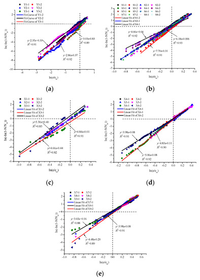 According to the above analysis, the cumulative energy value of MS signals had an accelerated release process of energy when approaching the failure, which corresponded to a critical point of the energy value. Vere-jones [59] put forward the theory of energy critical point, and then a large number of researchers adopted different mathematical models to study the accelerated release process of energy, and gradually formed the theory of energy-accelerated release. The research results showed that the initial determination formula of the energy critical point was the power-law formula, namely,