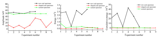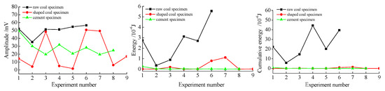 - The relationship between the change of MS parameters, such as the amplitude, energy and cumulative energy and loading rate had no obvious regularity. The amplitude of the MS signals generated by the raw coal specimens was approximately equal to that of the cement specimens, both of which were higher than the shaped coal specimens. In terms of energy and cumulative energy, raw coal was greatly higher than shaped coal and cement specimens. The energy ratio (EL/EH) could be used to characterize the process of deformation and fracture of coal and rock. EL/EH presented the trend of “quiet-growth-shortly quiet-growth” under the condition of experiment. When there was a trend of “growth-shortly quiet-growth”, and EL/EH was more than 10, an early warning could be in effect. Besides, the combination of cumulative energy prediction method and EL/EH prediction method could effectively realize the monitoring and early warning of deformation and fracture of coal and rock. In all, the spectrum and energy evolution of MS signals could be used as a characterization method of the degree of damage of coal and rock materials.
