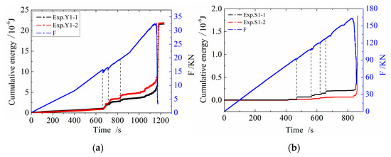 Exp.Y4–Y6 adopted the multi-stage loading mode. There were several stages in which loading forces remained unchanged. It is shown in Figure 5f–h that there were not evident MS signals when the loading force remained unchanged in the low force state, for example in 140–170 s and 270–300 s of Figure 5g or 250–280 s of Figure 5h. While, there were obvious MS signals when the loading force remained unchanged in the high force state, such as 780–1065 s of Figure 5h. The results are similar to the previous studies on acoustic emission under constant load [49,50]. The phenomenon is associated with “creep” characteristics of coal materials. The internal damage of the coal sample in the low stress stage was small so that there was no visible MS signal. However, the internal damage was big in the high stress stage [51]. Although the stress remains constant, there was still crack propagation accompanied with the occurrence of many MS events.