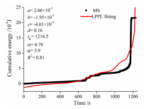 Considering that there is an accelerated release phase of MS signals energy when coal and rock materials are approaching the failure, the LPPL fitting result of cumulative energy of MS in Exp. Y1 is shown in Figure 28. It can be seen that the LPPL model had a good fitting effect, and the rupture time inferred from MS was estimated to be 1214.5 s. The cumulative energy prediction method could effectively make up the shortcomings of EL/EH prediction method and could predict the time point of instability failure of coal and rock. In conclusion, the combination of the cumulative energy prediction method and the EL/EH prediction method could effectively realize the monitoring and early warning of the deformation and fracture of coal and rock materials.