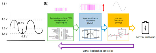 The voltage amplitude and frequency of the charging strategy in this paper follow those from the theoretical model in [11]. The waveform is shown in Figure 1a. We have already verified and demonstrated that this composite sinusoidal waveform is effective in prolonging the 18650 lithium-ion battery life [12]. The waveform has voltage level of 3.6 V. The upper cycle and lower cycle are 0.7 V and 0.2 V, respectively. The frequency is 1 kHz. As the cell voltage reaches the full voltage, the lower cycle of the waveform can discharge the battery. The circuit we developed can generate such a waveform. Figure 1b shows the roadmap that the circuit comprises three parts. The first part is a pulse width modulation (PWM) for generating a digital signal of the composite sinusoidal waveform. The second part is to amplify the digital signal to the power level. The third part is a low-pass filter circuit that converts the digital signal into a voltage waveform for effective battery charging. In addition, we reserved a signal feedback function in the program [17,18], such that the circuit can provide the appropriate charging waveform in real time by incorporating databases and artificial intelligence (AI) decisions in the future. The microchip dsPIC30f4011 digital signal processor (DSP; Microchip Technology Inc., Chandler, AZ, USA) [19] with high computing speed and low delay time was selected as the important component of composite waveform generation to allow the frequency of the output waveform to be above 1 kHz to avoid the impact of resolution on the waveform, and to reduce slowing down of Microcontroller Unit (MCU) processing by analog-to-digital reading. The charging circuit design adopts the buck circuit architecture, with TLP250 selected as the inner gate driver. In addition to driving MOSFET, it also isolates the signal from the power level. Metal-Oxide-Semiconductor Field-Effect Transistor (MOSFET) adopts the P-type IRF9540N and N-type IRF3705. Subsequently, restoration of the composite waveform is achieved by an LC low-pass filter.