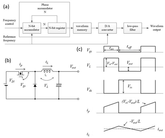(a) Direct digital synthesis; (b) Buck converter; (c) Working sequence diagram of the buck converter.