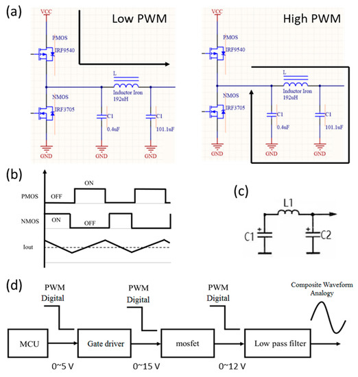 The working sequence is shown in Figure 3b. The charging loop filter is designed to adopt an LC π filter with low impedance input and output, as shown in Figure 3c. First, capacitor C1 removes most of the AC components. Then, the L1 and C2 filter are passed through. L1 presents a very high resistance to the AC component. Thus, the AC voltage drop over L1 is large, and the AC component supplied to the load is small. As for the DC component, because L1 does not exhibit inductive resistance, it is equivalent to an open circuit. Simultaneously, the filter inductor adopts a thick wire diameter with very small DC resistance. Therefore, no drop occurs for the DC voltage, resulting in relatively high DC output voltage. These are the main advantages of adopting an inductor filter. After repeated experimental designing as described above, we obtained the values for C1 to be 0.4 μF, L1 to be 192 μH, and C2 to be 101.1 μH. As the desired waveform output is in contrast to the stable DC output, which is the target of a buck architect, and the fixed duty cycle of the PWM is replaced by a variable in real-time PWM duty cycle signal. As verified by circuit simulation software, the composite waveform can be successfully generated.