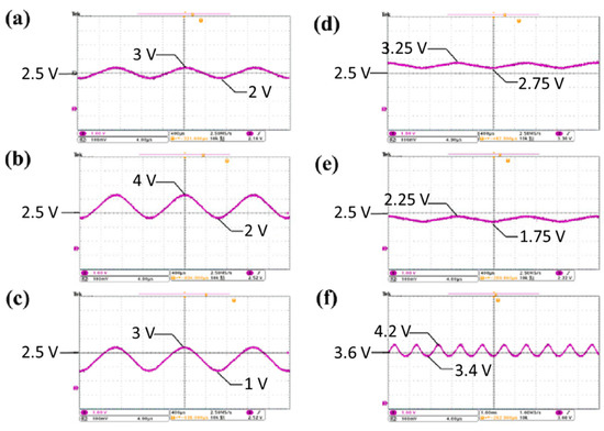 The target waveform takes reference from the optimized battery charging waveform described in [11], which ranged within 3.6 V. The waveform with an upper half-cycle of 0.7 V and lower half-cycle of 0.2 V is taken as the waveform for verification. By passing through the LC low-pass filter with L at 12.5 mH and C at 1 μF, as designed above, a waveform can be output as shown in Figure 4f.