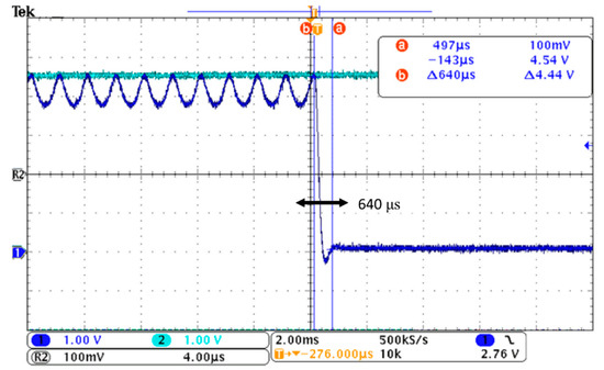 This study predefines an average current less than 0.05 C as the condition of charge cut-off. When the above condition is met, the composite wave charging of the battery is completed. If the average current is not less than 0.05 C, then 1 is added to the PWM counter, and the output of the composite waveform to charge the battery continues. Figure 5 shows the required time in an applied operation. When the voltage is higher than 4.4 V, the microprocessor will instantly turn off the signal output with the turn-off time being 640 μs. Charging of the battery is suspended until the battery voltage returns to the normal criterion.