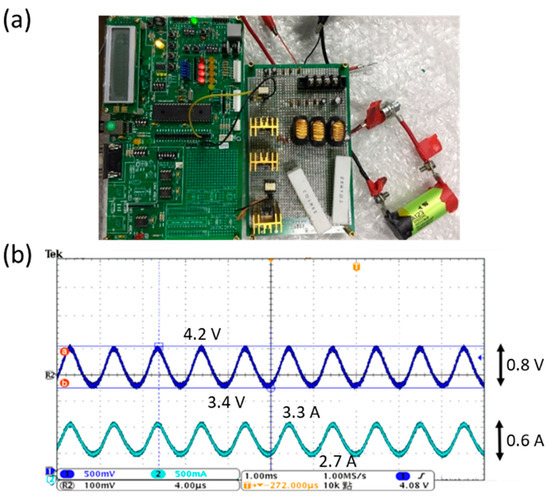 The left portion of Figure 6a shows the microchip dsPIC30f4011 module. Through the RE0 pin, the PWM signal is sent to the gate driver, which is above the right side of the Printed Circuit Board (PCB) board. The gate driver drives the Complementary Metal-Oxide-Semiconductor (CMOS) architecture composed of PMOS and Negative Channel Metal Oxide Semiconductor (NMOS) on the left side of the PCB board. The output of power level PWM is restored to the composite charging waveform through the low-pass filter composed of wire-wound toroidal inductors, electrolytic capacitors, and ceramic capacitors on the right side of the PCB board. Adopting a 1.2 ohm cement resistor with a power of 20 W as the output load, a circuit load test is performed. The output voltage level will drop after the resistive load is connected. Therefore, a DC power supply is used for voltage compensation to increase the voltage from the original 5 to 6.2 V with the output current limited at 4.5 A. On passing through the charging circuit, the composite waveform output is generated. Figure 6b shows the final output of composite voltage and current waveforms, which display no discrepancy as compared with the desired target voltage waveform.