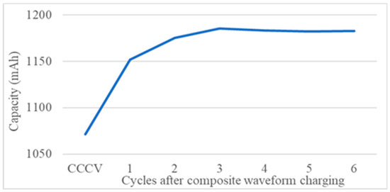 Effects of the circuit on the charging of the battery were then demonstrated. A LiFePO4 18650 battery (Pihsiang Energy Technology Co., Ltd.) was used. The original capacity of the battery was 1450 mAh. A conventional charging method with constant current–voltage of 5–3.7 V and constant current discharge of 5 A, with 600 charging–discharging cycles at room temperature, was used to age the battery. The charging and discharging processes have at least a 15 min rest between cycles, a 12 h rest every day, and a 60 h rest every weekend. The capacity of the aged battery was approximately 1065 mAh. Experiments of capacity recovery were then performed using the circuit to charge the aged battery. Figure 7 presents the results. After the first cycle involving charging using the composite waveform, the capacity increased to 1161 mAh, an improvement of approximately 6.7% from the original rated power was observed. In the following few cycles, the capacity was maintained at a high level. The maximum of recovery capacity is about 8%. The result is consistent with that of charge–discharge machine which we have done via commercial charging instrument [12].