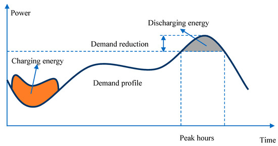 Illustration of an electricity load profile where its peak demand is reduced through the use of energy storage (ES), which discharges during peak hours (i.e., acts as a generator of electricity) and charges during off-peak hours (i.e., acts as a load).