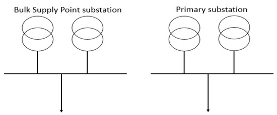 Diagrams of two substations: a bulk supply point substation (e.g., 132/33 kV) and a primary substation (e.g., 33/11 kV), each of which supplies a load.