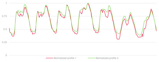 Normalized time-series for load profiles 1 and 2. The profiles span a period of seven days, with the fourth day being the one that exhibits the peak demand.