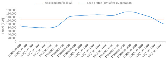 Figure 4 shows an example of storage operation aimed at peak minimization with application to load profile 2 during the peak day. The initial time series, shown in blue colour, which has a peak of 170,363 kW, is minimized in terms of its peak through ES operation. The resulting time series is shown in red colour and has a peak of 128,695 kW, thereby achieving a 41,668 kW peak reduction. This case corresponds to an ES plant with power capability equal to 50% of the peak demand of the initial profile, i.e., 85,181.5 kW, and 100% efficiency while requiring 8 h for a full charge. Hence, the calculated F-factor is equal to 41,668/85,181.5 = 49% (see Table 2).