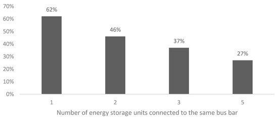 Finally, it is interesting to note that when more than one storage unit is connected to the same bus, the F-factor of the total storage capacity is a non-increasing function of the number of these connected ES units. This, as shown in Figure 6, essentially means that increased investment in storage per bus does not increase the contribution to the security of supply provided by the combined investment capacity. This can be shown by selecting any type of storage unit from the above tables. For instance, it is found in Table 1 that a 100% efficient storage unit with power capability equal to 10% of the peak demand and with 1 h duration has an F-factor equal to 62% (see row 1 and column 1 in Table 1). That is, when only such a storage unit is connected to the primary substation, its F-factor is 62%. On the other hand, when two storage units of this type are connected to the primary substation, their combined power capability is equal to 10% + 10% of the peak demand, which means that it is equivalent to having connected one unit of the same type but with twice the power capability. Such a unit provides an F-factor value equal to 46%, as can be observed in Table 1 (row 1, column 4). In the same vein, when three such units are connected to the same bus, the F-factor for the combined storage capacity is equal to 37% (row1, column 7 in Table 1), and with five such units, the combined F-factor is equal to 27% (row 1, column 10 in Table 1). Hence, investing in increased storage capacity for a bus leads to reduced F-factor for the combined storage system, because according to equation (1), the achieved peak demand reduction is less than the increase in the total storage power capability.