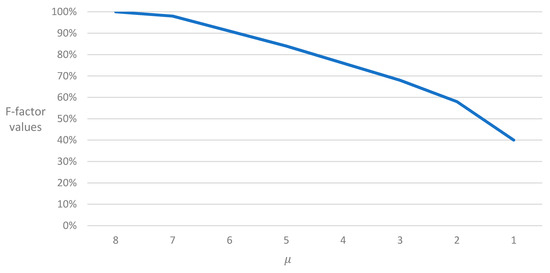The graph illustrates the effect of degradation on the F-factors assuming that initially the unit has µ = 8 h and this value reduces through time, leading to a reduction of F-factor values. The horizontal axis indicates parameter µ, i.e., the number of hours required for a complete charging or discharging of the ES unit. The values on the vertical axis illustrate the corresponding F-factor value. The storage unit is 100% efficient with power capability equal to 20% of the peak and corresponding to load profile 2 as in Table 2.
