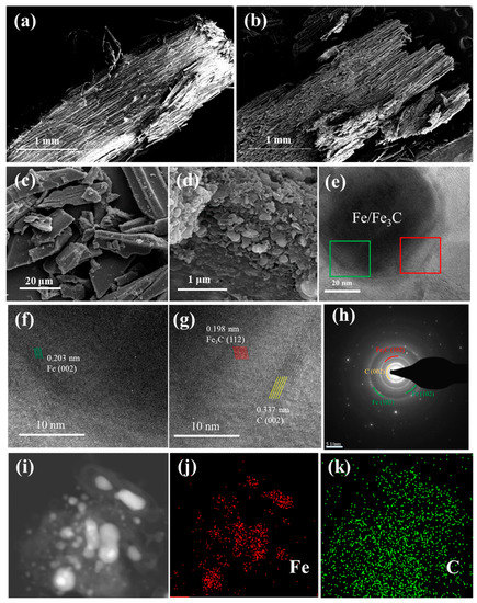 FE-SEM images of (a) raw sawdust, (b) the mixture of sawdust@Fe(NO3)3, (c–d) Fe/Fe3C@GC composite, (e–g) TEM image of Fe/Fe3C@GC composite, (h) selected area electron diffraction (SAED) pattern of Fe/Fe3C@GC composite, and (i–k) EDS mapping of Fe/Fe3C@GC composite.
