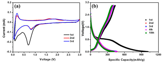 (a) Cyclic voltammetry (CV) profiles with the voltage window of 0.01–3.0 V and the scanning rate of 0.05 mV s−1, and (b) charge–discharge profiles of the Fe/Fe3C@GC cell at 45 mA g−1.