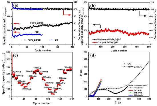(a) Cycling performances and Coulombic efficiency of the Fe/Fe3C@GC and graphitic carbon (GC) cells at 200 mA g−1, (b) long cycling performance and Coulombic efficiency of the Fe/Fe3C@GC cell at 500 mA g−1, (c) rate performance of the Fe/Fe3C@GC cell at different current densities, and (d) electrochemical impedance spectra (EIS) spectra of the Fe/Fe3C@GC cell and the GC cell.