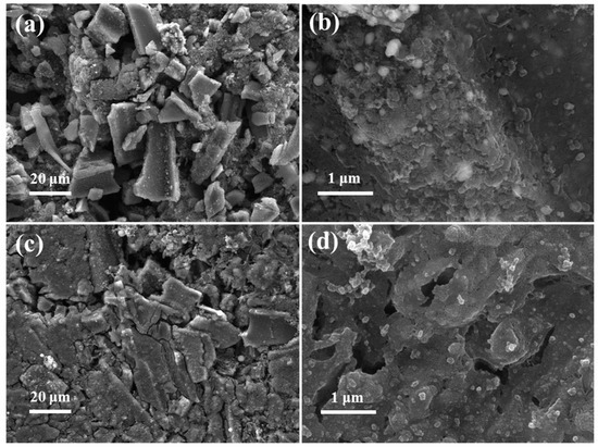 As shown in Figure 6, the surface morphologies of the Fe/Fe3C@GC electrode at the fresh state and fully-charged state after 500 cycles at 500 mA g−1 were observed with FE-SEM. Even after long cycles, the structural integrity of the Fe/Fe3C@GC electrode can be maintained as shown in Figure 6a and c. In the enlarged image (Figure 6d), the surface morphology of the Fe/Fe3C@GC electrode after long cycles showed an ambiguous surface due to the continuous charge–discharge processes, but the active substance particles are similar to the initial state (Figure 6b), indicating the structural stability of the Fe/Fe3C@GC composite.