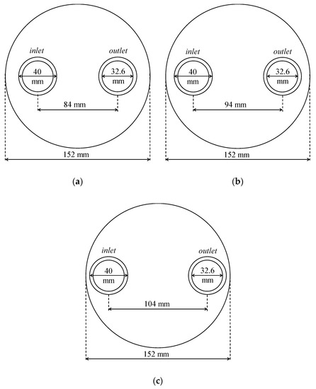 We considered nine BHE geometries, with BHE diameter Db = 152 mm, shank spacing d = 84, 94 and 104 mm, length L = 50, 100 and 200 m, pipes with internal diameter Dpi = 32.6 mm and external diameter Dpe = 40 mm. Sketches of the BHE cross sections considered are illustrated in Figure 1.