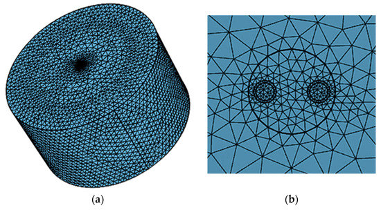 For each geometry, the computational domain has been meshed with unstructured tetrahedral elements. Due to the rescaling coefficient, the selected mesh, illustrated in Figure 2, is independent of the BHE length, and has 1,369,572 elements for d = 84 mm, 1,444,394 elements for d = 94 mm, and 1,510,647 elements for d = 104 mm.