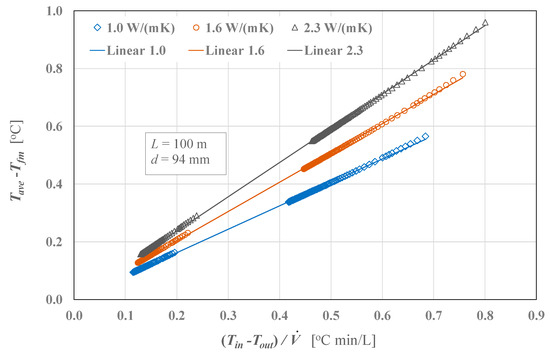 The simulation results revealed that, after 2 h of operation with constant Tin and , the quantity Tave − Tfm becomes a homogeneous linear function of that depends only on L, d, and kgt. Thus, a homogeneous linear regression of Tave − Tfm as a function of has been determined for each BHE geometry and for each value of kgt, by employing the simulation results for τ ≥ 2 h. The angular coefficient of each expression, divided by = 12 L/min, gives a value of φ for the quasi-stationary regime, denoted by φ∞. The linear regressions obtained for L = 100 m and d = 94 mm are illustrated, as an example, in Figure 3. The values of φ∞ are reported in Table 2.