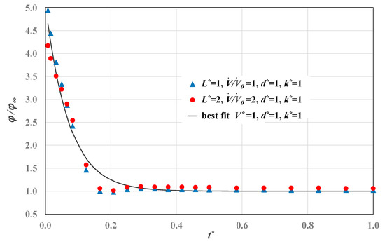 Four values of V* were considered, namely 0.5, 1, 2 and 4. The coefficients a and b were determined by fitting values of φ/φ∞ as a function of t* obtained numerically. Figure 4 illustrates the best fit for V* = 1, d* = 1, k* = 1, that was obtained through two simulations: with L* = 1, , d* = 1, k* = 1, and with L* = 2, , d* = 1, k*= 1. As shown by the figure, the best-fit curve yields very accurate values of φ/φ∞, except for 0.125 < t* < 0.25, where it slightly overestimates the simulation results.