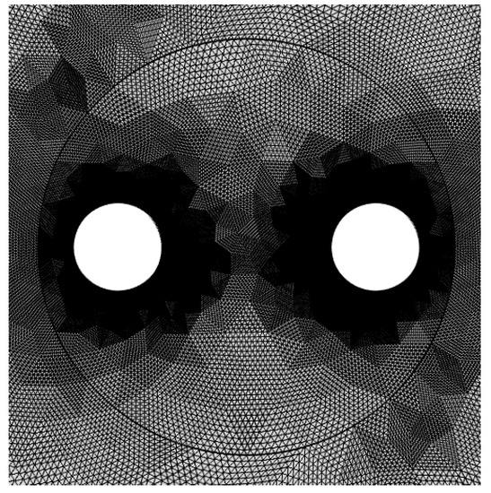 Particular of the mesh adopted to determine Rb, for the validation of the 3D simulation code. The boundary between the polyethylene pipes and the grout is hidden by the triangular elements.