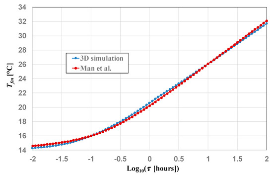 The diagrams of Tfm versus the decimal logarithm of time in hours obtained by the 3D finite element simulation and by the numerical integration of Equation (17) are compared in Figure 6, in the time range between 10−2 h and 102 h. The mean square deviation between the results of the finite element simulation and those obtained by the model by Man et al. [35] is 0.26 °C. The small discrepancies that occur from 10−2 to 10−1 h are very probably due to the non-perfect accuracy of the analytical model, that does not consider the exact total value and distribution of the BHE heat capacity. On the contrary, those occurring from 10 to 102 h are probably due to numerical errors in the 3D simulation, that increase with time.