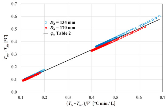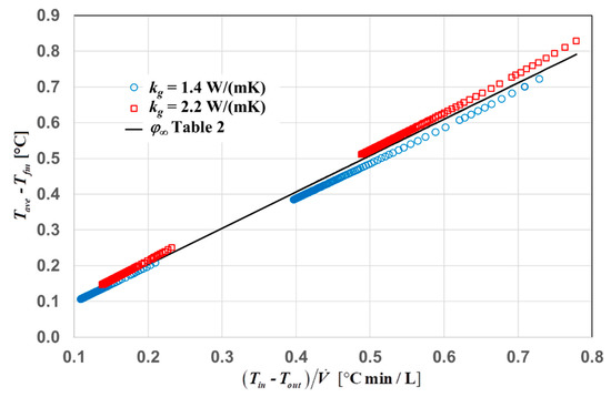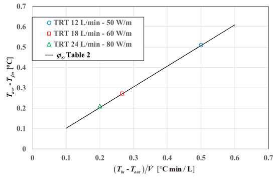 The applicability of the values of φ∞ reported in Table 2 to other working conditions is shown in Figure 9, that refers to thermal response tests (TRTs) performed on a borehole with L = 100 m, d = 94 mm, kgt = 1.6 W/(mK), kg = 1.8 W/(mK). The working conditions are = 12 L/min and ql = 50 W/m for the first TRT, = 18 L/min and ql = 60 W/m for the second TRT, = 24 L/min and ql = 80 W/m for the third TRT. In a TRT, Tin − Tout is a constant and Tave − Tfm becomes constant after 2 h. Therefore, only one value of Tave − Tfm as a function of is obtained for each TRT, in the quasi-stationary regime. In Figure 9, the values of Tave − Tfm as a function of obtained for the TRTs described above are compared with the line obtained by employing the value of φ∞ reported in Table 2. The points that represent the results for the TRTs lay on the correlation line.