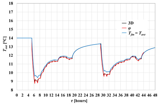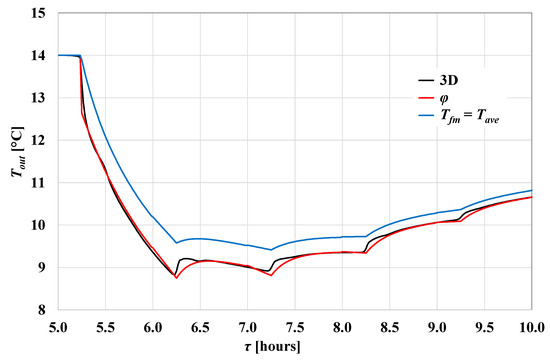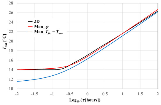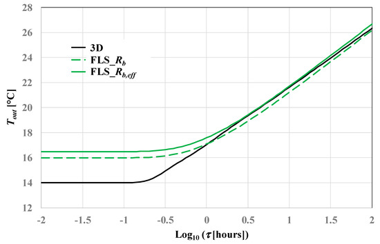 The time evolution of Tout obtained by applying the FLS model and Rb and that obtained by applying the FLS model and Rb,eff are compared in Figure 10 with that obtained by a 3D finite element simulation performed by the method described in Section 2 and the grid illustrated in Figure 2. The time interval considered is from 10−2 h to 102 h, in the logarithmic scale.