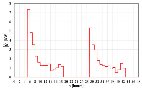 Consider the same BHE as in Section 4 (L = 100 m, d = 94 mm, kgt = 1.6 W/(mK), (ρ c)gt = 1.600 MJ/(m3K), kg = 1.8 W/(mK) (ρ c)g = 2.500 MJ/(m3K), Tg = 14 °C), but with = 12 L/min and ql = 50 W/m (i.e., = 5000 W), as in the first TRT considered in Section 5. The water properties have the same values as in Section 4. The convection coefficient is h = 1303.8 W/(m2K) [45]. The BHE thermal resistance, determined by a 2D steady state simulation by the method explained in Section 4, is Rb = 0.09965 mK/W. The effective BHE thermal resistance has been determined by Hellström’s analytical expression [47]: