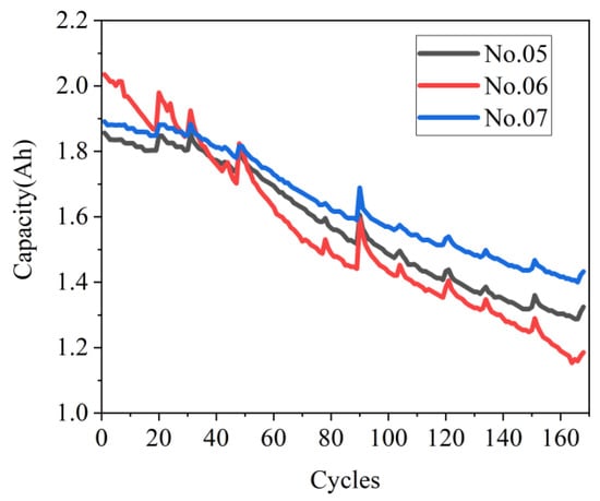 To observe the declining trend of SOH under various conditions, it is critical to conduct cyclic charge-discharge experiments. The dataset was provided by the Prognostics Center of Excellence at NASA Ames []. The three 18,650 LIBs numbered 05, 06, and 07 were produced by Idaho National Laboratory. The rated capacity and voltage of each battery are 2.2 Ah and 3.7 V [], respectively. Three batteries were run through three operations (charging, discharging, and measuring impedance) at 24 °C: first, the batteries were charged at a constant current of 1.5 A until the voltage reached 4.2 V. Then, they were charged at a constant voltage until the current dropped to 20 mA. Next, the batteries were discharged at a constant current of 2 A until the voltage reached the discharge cut-off voltage. The conditions are enumerated in the Table 1, and their discharge cut-off voltages are inconsistent. Figure 1 shows the capacity aging curves of these three batteries.