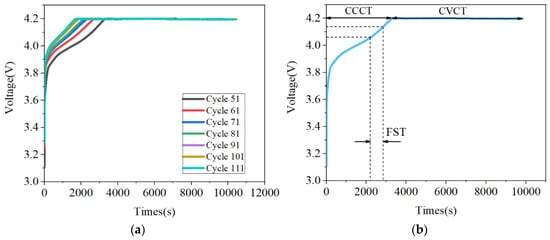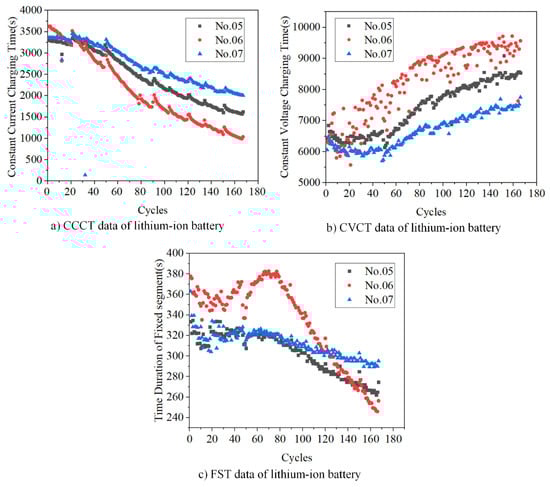 According to the above analysis, the internal electrochemical reactions of a lithium battery are closely associated with the battery charging mode. Therefore, to improve the accuracy of SOH estimation, three features (the constant current charging time (CCCT), the constant voltage charging time (CVCT), and the time duration of the fixed segment (FST) that reflect these dynamic changes are extracted as follows: