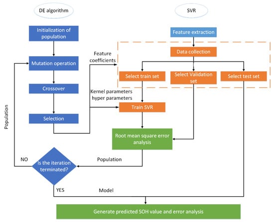 However, most feature-based data-driven methods simply use signal processing methods to process single health indicators without considering the possible coupling relationships between the various health indicators. In addition, modification of the model affects the accuracy of the prediction. Moreover, most available optimization programs often fall into locally optimal solutions due to the prevailing difficulty of adjusting the hyperparameters in a data-driven method. Hence, a differential evolution (DE) algorithm is used here for parameter optimization and a hybrid model for SOH estimation is proposed that is based on the DE algorithm and an improved support vector regression (SVR) algorithm. The main contributions of this paper are as follows: