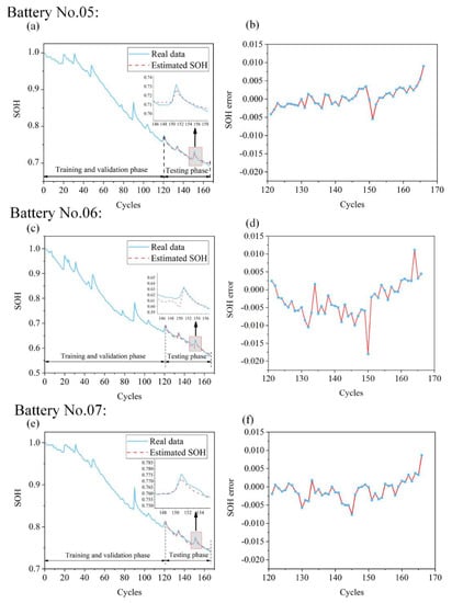 First, to ensure satisfactory prediction accuracy, we chose the first 90 cycles as the training set, the 91st–120th cycles as the verification set, and the remaining cycles as the test set. Figure 5 presents the SOH estimation values and the estimation errors for batteries No. 05, 06, and 07; Figure 5a,c,e correspond to battery SOH prediction processes for the three tested batteries.