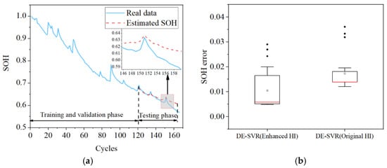 As discussed in Section 3.4, we used battery No.06 as an example to demonstrate the advantages of using enhanced HI. We utilized the same improved hybrid model for testing, with the only difference being that the inputs to the model were the three original features and the enhanced health indicator. Figure 6a presents the SOH estimation process with the original HIs used as model inputs. It is observed that the obtained curve in terms of the fitting trend, is not as accurate as that obtained via the proposed method. By contrast, higher accuracy is observed when the enhanced HI used, according to the SOH estimation errors that are plotted in Figure 6b when two HIs are used as model inputs. Therefore, the use of enhanced HI can yield more accurate SOH estimated values.