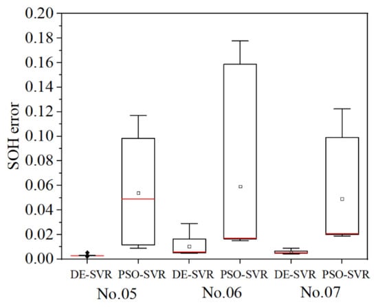 We now compare the proposed method with other methods. For example, in [] the authors proposed an algorithm that is based on PSO and SVR for estimating battery SOH, in which the battery capacity is selected as the feature and the data of NASA are used as well. Therefore, in this section, algorithms that are based on PSO and SVR are used in experiments to reproduce the prediction process. Each method is tested 50 times on each of the three batteries, and a box diagram is obtained as shown in Figure 7, according to which the method in [] is outperformed by the method that is proposed in this paper in terms of accuracy, even though the difficulty of accurately measuring the battery capacity during the test is not considered. For battery No. 06, both methods have unsatisfactory robustness. This can be attributed to a feature of battery No. 06, namely, the TD feature of the battery fluctuates violently in the first 60 cycles. Additionally, the method that is proposed in this paper exhibits fewer overfitting phenomena, and the robustness of DE-SVR is higher than that of PSO-SVR.