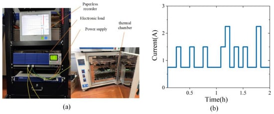 The NASA data set is built on the premise of a constant current discharging process. This condition may be difficult to satisfy in practical application scenarios. Therefore, this paper used an 18650 lithium-ion battery that is labeled as NCR18650PF and manufactured by Panasonic. The battery has a rated capacity of 2.7 Ah. The nominal voltage is 3.6 V, and the highest and lowest cut-off voltages are 4.2 and 2.5 V, respectively. Figure 8a shows the equipment that was used for the battery test experiments. It includes a Kikusui PWX1500MH power supply, and a PLZ-4WH programmable electronic load for controlling the discharging current, a Yokogawa paperless recorder for data monitoring and storage, and a thermal chamber. Figure 8b shows the dynamic discharging current sequence. The current ranges from 0.75 to 2.25A and each time segment is 5 min. In addition, the sequence is randomized in order to simulate the actual working conditions. It is worth mentioning that we adopted NASA dynamic operating conditions [], to ensure that the battery can perform the complete discharging process each time before it reaches the end of life (EOL).