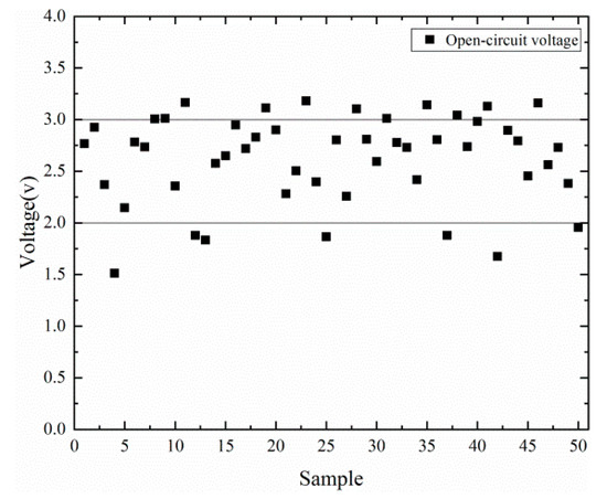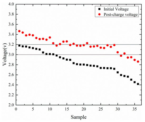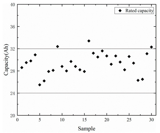 After the power from lithium-ion battery packs is retired from EVs, the dump energies can be used for the energy storage field. The retired battery pack studied in this paper retired from an electric sanitation vehicle made by Dongfeng Automobile Co., Ltd in Wuhan, China. The factory parameters of the power from lithium-ion battery are as follows: the rated capacity is 40 Ah, the nominal voltage is 3.2 V, the internal resistance is 1 mΩ, the charging cut-off voltage is 3.6 V, the discharging cut-off voltage is 2.5 V, and the standard charge and discharge current is 0.3 C. The whole retired battery pack has 106 battery cells and consists of two layers. The echelon use of retired batteries for the energy storage system is considered in this paper. Safety testing and consistency sorting are required before the retired batteries are balanced. Firstly, through appearance screening, short circuit test, acupuncture test, high-temperature test, and over-charge and over-discharge test, a total of 50 retired batteries with good appearance and safety were selected. Secondly, OCV of 50 retired batteries was measured and the voltage distribution of 50 retired batteries is shown in Figure 1. After removing 14 retired batteries with a voltage less than 2.4 V, a total of 36 retired batteries with a voltage of between 2.4 V and 3.2 V were obtained. Then, in order to prevent over-charge, the 36 retired batteries were charged with 10 A constant current for 2 h, and then we measured the voltage of each battery. As shown in Figure 2, there were 30 retired batteries with a voltage greater than 3 V after charging, which has an echelon use value. Thirdly, we determined the capacity sorting for the remaining 30 retired batteries. Because the capacity of the retired battery is much lower than that of the factory battery, it was necessary to recalibrate the rated capacity of retired batteries before balancing them. The capacity test was based on national standards GB/T 34015-2017 “Recycling of traction battery used in electric vehicle—Test of residual capacity“, and the capacity test steps of the retired battery are as follows: (1) under normal temperature, discharge the residual energy of the retired batteries and let it stand for 15 min. (2) Charge the retired batteries at a constant current of 1 C to the cut-off voltage of 3.6 V, and then switch to constant-voltage charging until the current drops to 0.05 C. (3) Let them stand for 0.5 h. (4) Discharge the battery at a constant current of 1 C to the discharge cut-off voltage of 2.5 V, record the discharge capacity. (5) Repeat Steps (1) to (4) five times in total, use the average value of the discharge capacity of five times as the new rated capacities of the retired batteries. When the range of three continuous test results is less than 3% of the factory rated capacity, the test can be terminated in advance, and the average value of the last three test results is used as the new rated capacities of the retired batteries. The new rated capacity distribution of 30 retired batteries is shown in Figure 3. It can be seen from Figure 3 that the capacities of most retired batteries are between 24 Ah and 32 Ah. As shown in Table 1, a total of 12 retired batteries with a larger rated capacity were selected from 30 retired batteries and were connected in series, numbered as B1, B2, …, B12, as the object of simulation and experiment in this paper.