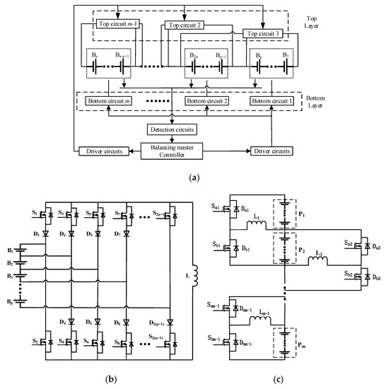 As shown in Figure 4c, the distributed equalization topological structure based on the bidirectional BUCK-BOOST circuit is adopted in the top layer. Each two adjacent battery groups equipped with one distributed bidirectional balancing circuit, battery group m-1 and battery group m, are equipped with a top circuit named top circuit m − 1. They can implement an energy flow between adjacent battery groups, which makes the equalization system have strong expansibility features and makes them easy to modularize.