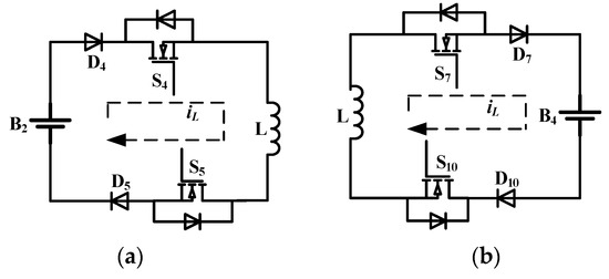 Stage 1: charge L. As shown in Figure 5a, the switches S4 and S5 are turned ON, other switches are turned off. Cell B2 charges the inductor L. The inductor L stores energy with the current iL.