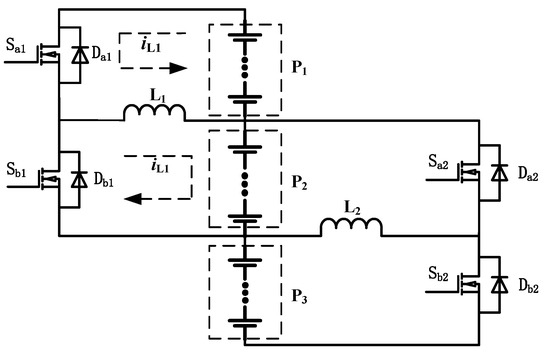 Figure 6 shows the equalization process of the top layer circuits, P1, P2, and P3, represent three battery groups. L1 and L2 are energy storage inductors, which can achieve bidirectional energy flow between adjacent retired battery groups. Suppose that the SOC mean value of battery group P1 is higher than battery group P2, the equalization process with two stages is shown in Figure 6.