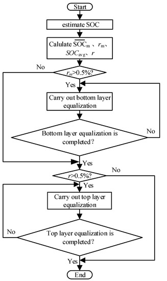 Because the consistency between the battery cells in the retired battery pack is poor, if the top layer equalization is carried out firstly, the degree of inconsistency between batteries will be aggravated, and the switching loss during the equalization process will be increased. Therefore, in order to reduce the difficulty of battery equalization and improve the energy utilization efficiency, the strategy of carrying out bottom layer equalization first and top layer equalization second is adopted, which can first ensure the retired batteries in a group are consistent. Figure 7 shows the flowchart of the proposed equalization algorithm. The following steps are used for the proposed equalization algorithm.