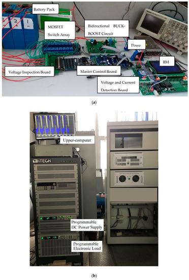 In order to verify the proposed equalization method and show the equalization performance, an equalization experiment with selected 12 retired batteries was implemented. The balancing experiment test bench and battery test system are illustrated in Figure 9a,b, respectively. The balancing experiment test bench included battery management system (BMS), master control board, voltage and current detection board, MOSFET switch array, bidirectional BUCK-BOOST circuit, voltage inspection board, retired battery pack, and power. The ITS5300 battery charge and discharge test system was used for battery performance testing. The inductors worked in discontinuous current mode (DCM).