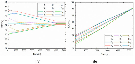 - Carry out bottom layer equalization algorithm. In order to improve the equalization efficiency, the “partition” idea is introduced and equalization paths are optimized. As shown in Figure 8a, according to SOC from low to high, batteries in the same retired battery group are sorted. The SOC values of retired batteries in area a are lower and need to be charged. Area b is divided into area b1 and area b2, the difference between the SOC values of batteries in area b and is within the threshold range. The SOC values of retired batteries in area c are higher and need to be discharged.