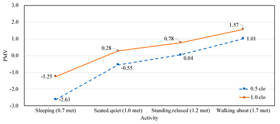 According to ISO 9920 [8] and Havenith et al. [9], clothing insulation is affected by the relative air velocity such as an occupant’s movement or wind speed. However, the purpose of Figure 1 is only intended to identify the impact of the metabolic rate on the PMV calculation. To clarify the effect of metabolic rate on PMV calculations, fixed values of clothing insulation were applied. The clothing insulations are 0.5 clo and 1.0 clo, respectively, which assumes two different conditions of the occupant clothing situations.