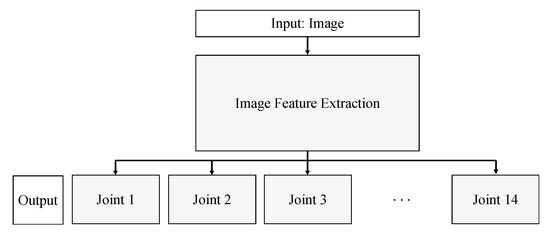 The structure of the preceding model includes a residual block with a DNN structure for accuracy improvement. The process of estimating the articulated pose is shown in Figure 2. The input images pass through the image feature extraction stage. According to the extracted image features, the 14 pairs of absolute coordinate values for each joint are output through the 14 joint-estimating blocks. The output of the preceding model is used as input data for the pose-categorization model.