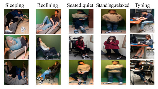 The pose-categorization model developed in this study classifies poses based on the coordinates of joints of the occupant in the image. For an automated and intelligent system, the DNN, which is widely used in various building fields, is applied [24,25,26]. The types of poses are selected based on indoor activities that mainly occur at home and in the office according to the ASHRAE 55 standard Table 5.2.1.2 Metabolic Rates for Typical Tasks [4]. Four home activities are selected: “Sleeping”, “Reclining”, “Seated.quiet”, and “Standing.relaxed”. Because of the sedentary environment, the office activities include two sitting activities: “Seated.quiet” and “Typing”and one standing activity: “Standing.relaxed”. Images corresponding to home and office activities were collected through direct shooting or from the internet. There are 30 collected images for each activity about various subjects. The number of images is increased by a factor of 112 by normalizing the image size to 128 × 128 pixels and by performing augmentation by reversing and rotating the images. Thus, the total number of images is 16,800 (5 activities × 30 × 112). Figure 3 shows sample images for each activity from the collected dataset.