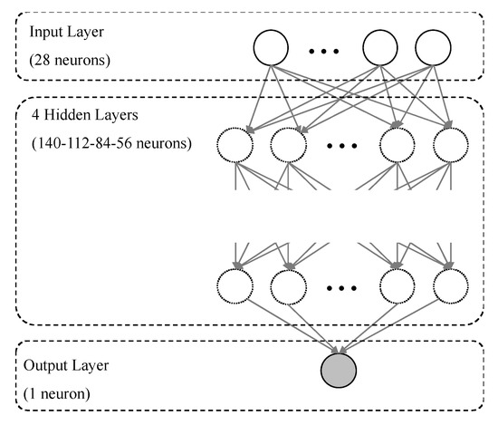 The structure of the pose-categorization model and the applied parameters are as follows. The model adopts an optimized DNN structure that exhibits an optimal performance for classifying 10 classes [27]. As shown in Figure 4, the structure comprises one input layer, four hidden layers, and one output layer. Because the 28 values from the 14 pairs of joint coordinates (x, y) are used as input data, the number of input neurons is 28 and the number of hidden neurons is 140-112-84-56. For the training, the cross entropy and Adam optimizer are used as error and optimization functions, respectively. Model parameters such as the rectified linear unit (ReLU), batch normalization, and drop-out method are employed.