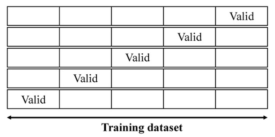 The pose-categorization model is trained and tested for home and office activities. The training dataset, which is the collected images, is separated as a valid dataset for verification. The valid dataset constitutes 20% of the training dataset; thus, the number of images in the training and valid datasets for each activity are 2688 and 672, respectively. The valid dataset preventing data-sampling bias is divided into five different datasets for each training, as shown in Figure 5. If the five training results are similar, the data are not biased, thereby ensuring the reliability of the training.